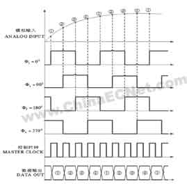 多路输出的时间交叉法模数转换是一个比较成熟的概念,这种方法不仅节省空间,并且能成倍提高现有的高性能ADC的采样速率,适合于需要高采样率的模数转换系统。时间交叉采样ADC系统采用的运行理念是:m路ADC中每一片ADC的采样频率是整个系统采样频率的1/m。每一路通道锁定在一个相位上,使系统作为一个整体在相等的时间间隔增量上采样,每片ADC在全速采样下得到连接完好的图像。图2给出了典型的四通道的时间交叉采样ADC系统的数据流图。最终输出的数据流是由系统中的每一通道的输出数据按照适当的顺序交叉输出产生的。