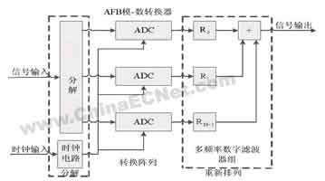 图3是AFB(Advanced Filter Bank)法的基本模块框图。通过使用特殊的多频FIR滤波器结构,AFB法可以通过一个简单的数字硬件平台实现,例如FPGA或CPLD。通过使用AFB法,时间交叉采样的ADC系统占用奈奎斯特频带的90%,并可以在任何一个转换器的奈奎斯特频带中进行设定。通过使用AFB的特殊的FIR结构和系数计算程序,就可以实现宽带宽匹配。